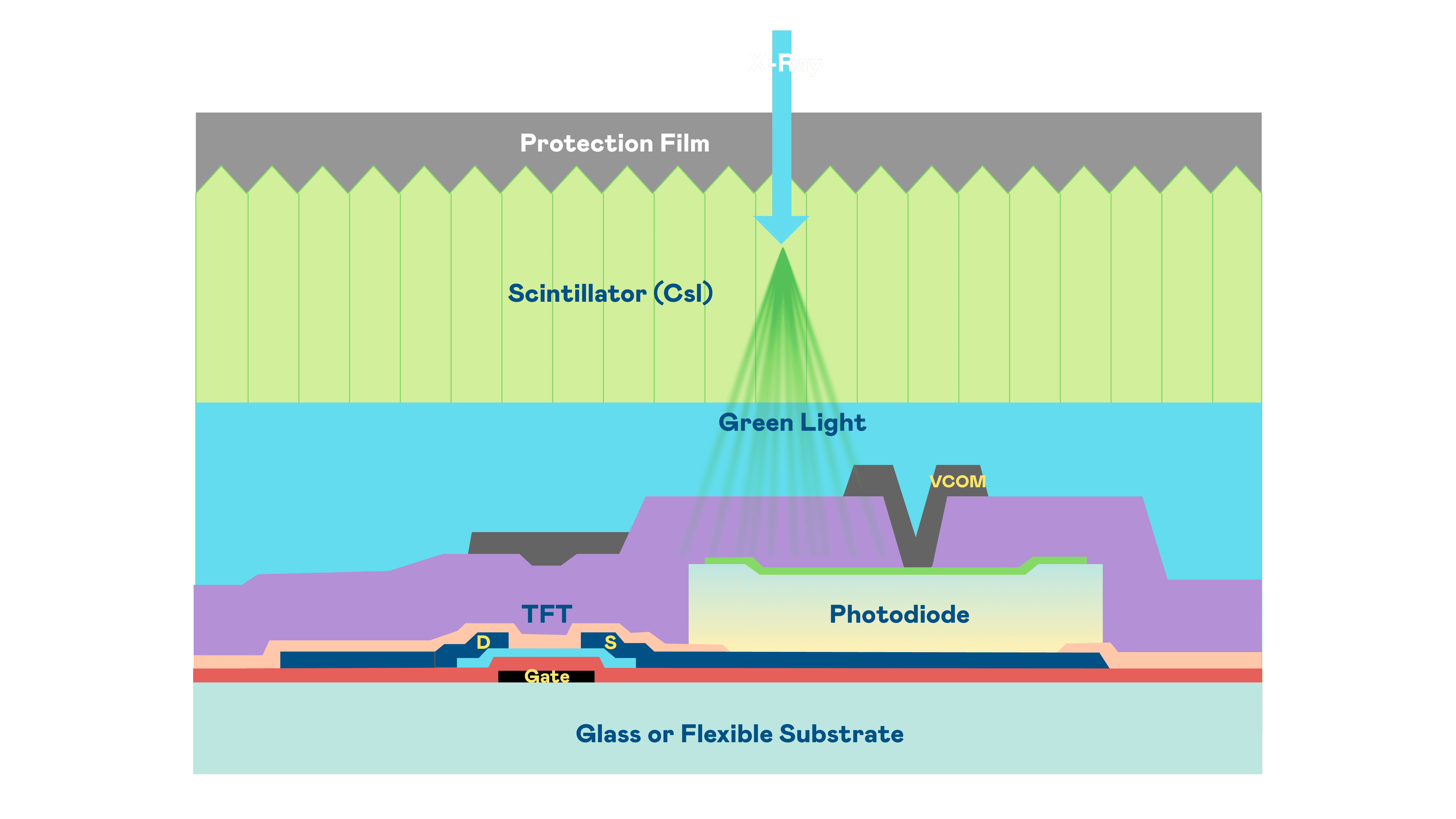尊时凯龙的X光影像感测阵列使用薄膜电晶体 (TFT) 作为每个像素的读取开关,,,搭配光电二极体(Photodiode)的光电转换元件,,用以感测X光影像讯号。。。